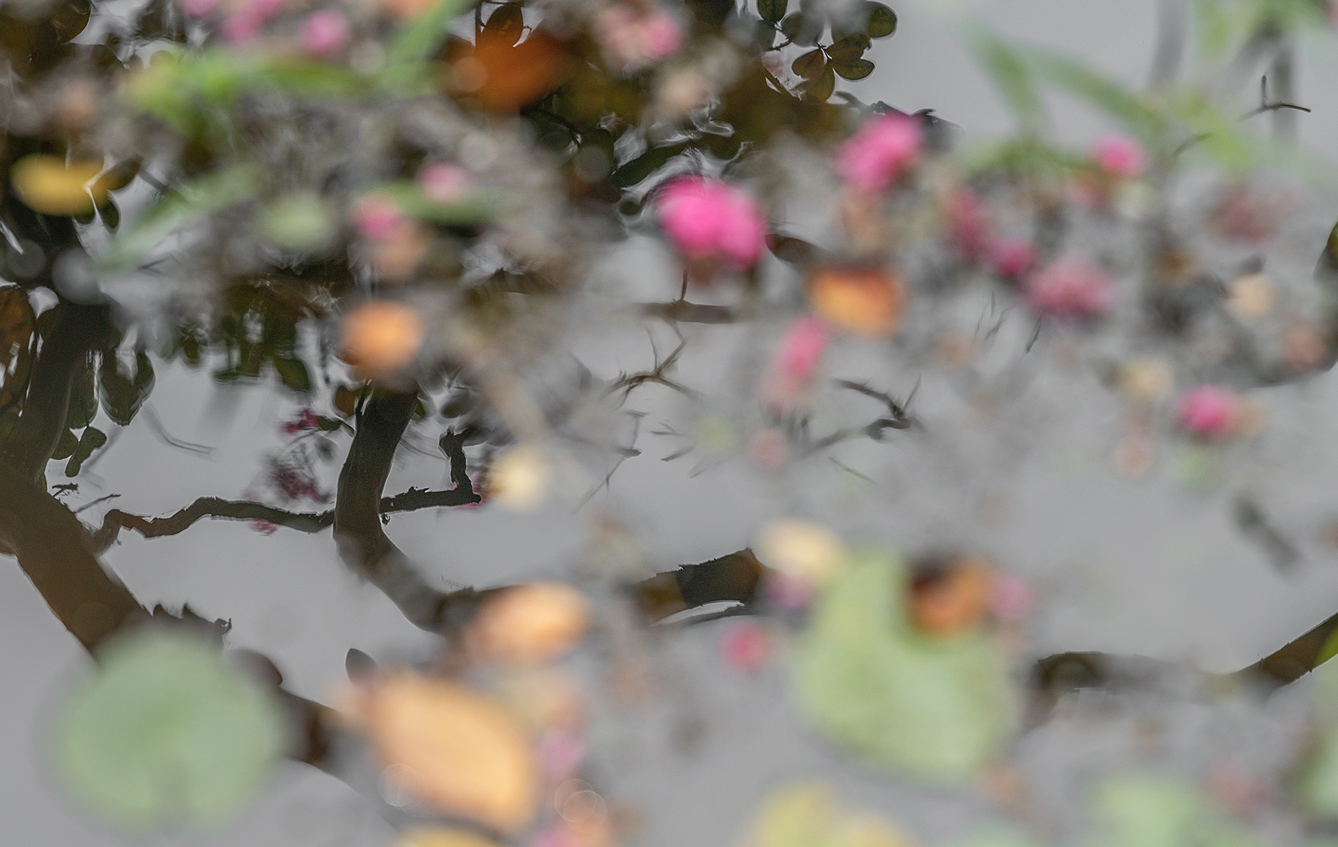배룡꽃잎과 나무잎이 물위에서 디시금 아름다움을 발합니다